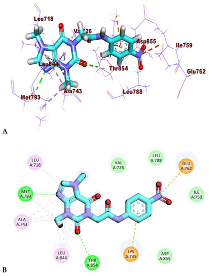 The designed compound, T-2-PNPA, was stacked onto the EGFRT790M catalytic site similarly to the native ligand, as shown in Figure 6. In the adenine pocket, the 3,7-dimethyl-2,6-dioxo-2,3,6,7-tetrahydro-1H-purine moiety achieved eight HIs with Leu844, Leu718, Ala743, and Met793 as well as two HBs with Thr845 and Met793. Moreover, two electrostatic interactions were observed in the hydrophobic pocket via the interaction of p-nitrophenyl moiety with Lys745 and Glu762.