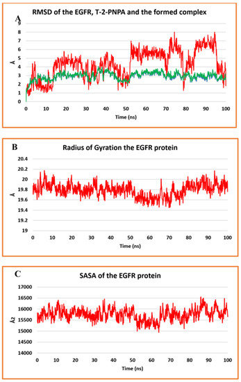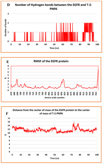 The MD analyses performed on the production run of 100 ns show that, overall, the system is stable. The RMSD plot (Figure 7A) shows equilibrated values for EGFR and EGFR–T-2-PNPA complex (blue and green curve, respectively) through the whole trajectory with an average value of 2.9 Å. Interestingly, the RMSD of the T-2-PNPA (red curve) shows very large fluctuations during the trajectory which indicates its large free motion inside the binding pocket, however, its distance from the center of mass of EGFR remains nearly constant with an average of 11.62 Å (Figure 7F). The RoG (Figure 7B), and SASA (Figure 7C) show a stable protein fluctuation with an average of 19.79 Å, 15755 Å2, respectively. H-bonds formed between the T-2-PNPA and EGFR (Figure 7D) shows that at least one H-bond is formed in 214 frames out of 1000 frames (21.4%). The amino acids’ fluctuation was depicted in the RMSF plot (Figure 7E) showing low fluctuation value (less than 2 Å) except for the G695:G700 (reaching 3.6 Å), and E842:V852 loop regions (reaching 3.6 Å) and the free C-terminal (reaching 7 Å).