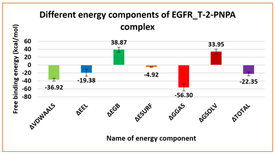 MM-GBSA of EGFR–T-2-PNPA complex showing energetic components and their average energy values. Bars denote the standard deviation.