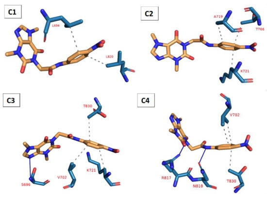 As already known, MD simulation can produce a very large number of frames that can have a minimal difference. Many methods to reduce the number of frames by selecting the ones that are conformationally different have been developed such as clustering and wavelet analysis [43]. In this work, we have utilized the clustering technique to reduce the data dimensionality and to obtain a representative frame for every produced cluster. As clarified in the experimental section (Supplementary Materials), cluster numbers were automatically calculated by the elbow method to produce four successive clusters. For each one, the PLIP webserver was employed to identify both number and types of interactions between T-2-PNPA and EGFR (Table 1). As can be seen, HIs are the common type of interactions between T-2-PNPA and EGFR with a total of 11 HIs compared to only three H-bonds. Additionally, a .pse file was generated to understand the 3D conformation of the T-2-PNPA interactions inside EGFR (Figure 10).