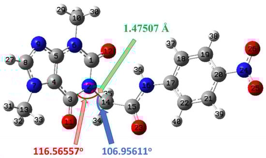 The level of theory used for all calculations was DFT/B3LYP/6-311G++(d,p). Without any restrictions, T-2-PNPA optimization was carried out and depicted in Figure 11. The intermediate and reactant were bound via the C14–N2 bond. The C14–N2 bond length and the two angles on both sides were recorded on the optimized structure, Figure 11. The dipole moment (Dm), which indicates the interaction within the compound, also determines the molecule’s polarity. According to Table 2, the Dm value is 11.321 Debye and the measured ground total energy (TE) is −34,966.4 eV.