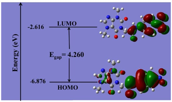 The computed energy gap (Egap) between T-2-PNPA’s HOMO and LUMO is −4.260 eV according to the FMO study, and the sketch diagram is shown in Figure 12. The calculated Egap value is low which indicates a small HOMO–LUMO gap in the border orbitals. The molecule under investigation, T-2-PNPA, showed high polarizability and chemical reactivity according to the calculated Dm and Egap values [44]. Table 2 shows the computed energies for HOMO (EHOMO), LUMO (ELUMO), and Egap.