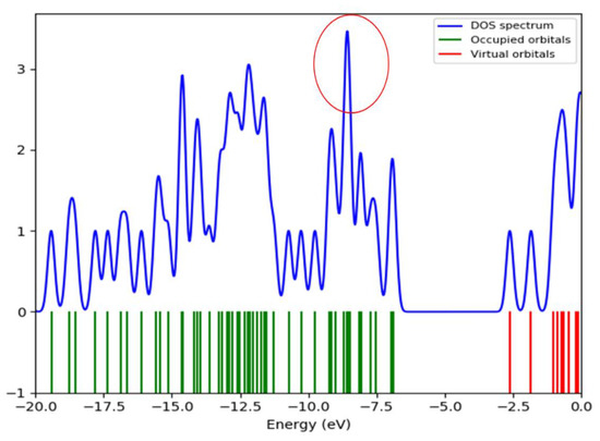 Due to the possibility of quasi-degenerate levels in the border region, LUMO and HOMO could not give an accurate description of FMO. Although FMO analysis is important, the HOMO–LUMO theory has some limitations and new efforts are necessary to understand when and how the HOMO energy works and does not work [47]. The occupied states’ number per unit volume is determined at equilibrium by a chemical system’s probability distribution function and the density of its states. This quantity is used to investigate the physical characteristics of chemical systems. Figure 13 shows that T-2-PNPA has a considerable narrow energy gap, as determined by the TDOS analysis, and the orbitals under the HOMO orbital had the highest reported intensities. Such findings highlighted the potency of the prospective inhibitor.