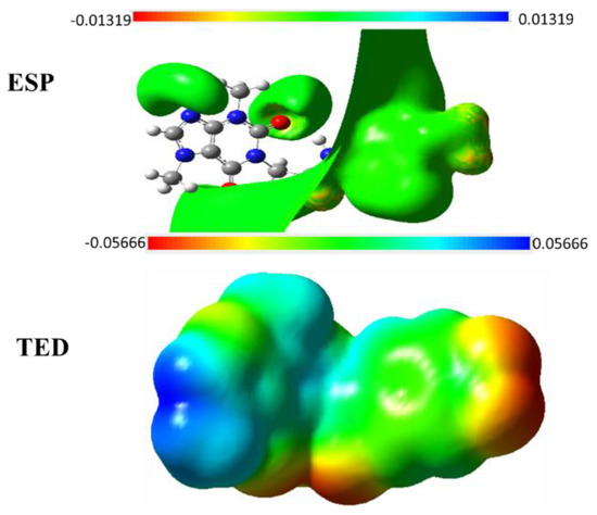 The total electron density surface (TED), also known as the potential (electron + nuclei) mapping, shows the distribution, size, shape, and dipole moments of the compound’s ESP. Figure 14 illustrates the TED and ESP of T-2-PNPA graphically. Green, blue, yellow and red sections indicate, respectively, the neutral electron, electron deficient, slightly rich, and electron-rich zones. The most negative potential zones are found around the carbonyl and nitrate groups, while the slightly electron-rich, yellow-colored regions are found over the terminal phenyl and N9 atom of the purine moiety. The purine substituted methyl (C13) and C8H27 of purine are blue patches that indicate an electron deficient zone.