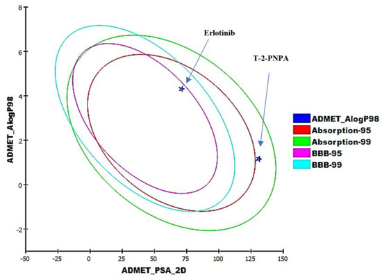 A compound becomes a drug based on its pharmacokinetic assessment and biological activity, so to prevent the late withdrawal of a new compound it should be studied early in the discovery process for ADMET properties [48]. Though ADMET identifies absorption, distribution, metabolism, excretion, and toxicity, there are a number of in vitro and in vivo studies that can explore the ADMET descriptors, but in silico studies are much more advantageous due to limitations of time, effort, cost, and to avoid the firm regulations governing animal testing [49]. Using Discovery studio®, these ADMET parameters were predicted computationally for T-2-PNPA based on its reference molecule, erlotinib. The ADMET results of T-2-PNPA comparing erlotinib (Figure 15) showed an acceptable degree of drug-likeness as it was predicted to have the very low ability to pass the BBB and is expected to be non-hepatotoxic and non-inhibitor against the cytochrome P-450, CYP2D6. Additionally, as shown in Table 3, T-2-PNPA exhibited good aqueous solubility and medium intestinal absorption levels.