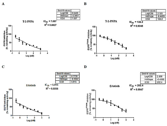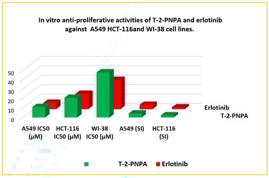 To verify the conducted computational results, the potentialities of T-2-PNPA against both wild subtype, EGFRWT, and the mutant subtype EGFRT790M of EGFR protein were investigated in vitro. T-2-PNPA firmly inhibited both proteins with IC50 values of 7.05 and 126.20 nM, respectively. Those results (Figure 16) were bordering erlotinib’s value (5.91 nM) against EGFRWT and much stronger than that against EGFRT790M (202.40 nM).
