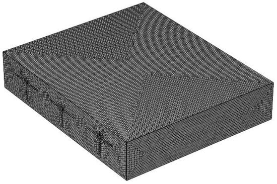 By discretizing the equations, the finite element approach was used to address the PCM melting and NFD flow problems [64]. The two-phase mixing technique was utilized to simulate the flow. The enthalpy method was used to resolve the PCM melt front. The optimal conditions for having a panel with the lowest temperature and having a NFD at the output with the highest temperature and the lowest pressure drop in the solar system were investigated using machine learning in order to more thoroughly examine the effect of parameters on the outputs. Design Expert software was used for this purpose. The domain was meshed using hexagonal pieces, as shown in Figure 2.