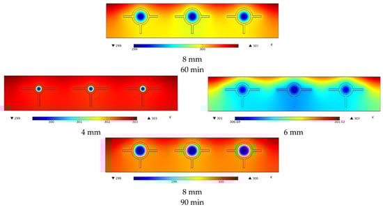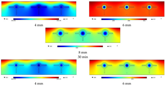 The temperature profile for pipes with diameters of 4, 6, and 8 mm at time intervals of 30, 60, and 90 min.