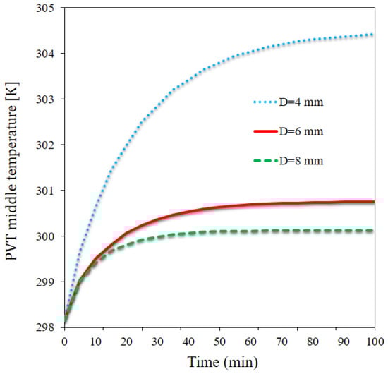 The average panel temperature for diameters of 4, 6, and 8 mm for 100 min.