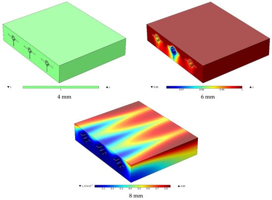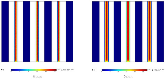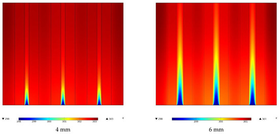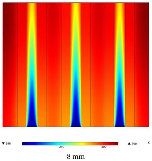 Figure 6 shows the velocity profile for pipes with diameters of 4, 6, and 8 mm in a horizontal cross section of the center of a panel. An underdeveloped flow regime was present at the pipe wall when the NFD entered the channel at a constant speed. However, the flow profile developed within a short distance. For a larger diameter, due to the larger pipe cross-sectional area and fixed input velocity, the NFD flowed through the pipe at a greater rate and absorbed and discharged more heat. However, for smaller D_Pipes, the fluid had fewer collisions with the wall in the middle of the pipe, leading to a lower output temperature.