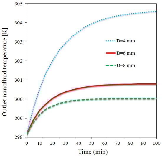 Figure 8 depicts the output flow temperature for D_Pipes of 4, 6, and 8 over time. The output temperature is a critical parameter for electrical efficiency improvement. It is dependent on the panel temperature, and a higher panel temperature leads to a higher output temperature. Given the constant solar heat flux on the solar panel, the output temperature was higher for lower D_Pipes. At larger flow rates, the flow had fewer collisions with the pipe wall in the middle of the pipe, resulting in less HTR to the NFD. Furthermore, for smaller D_Pipes, the PCM melted within a shorter time and the flow collided with the PCM at a higher temperature, increasing the flow temperature. As a result, the output temperature was higher for lower D_Pipes, and the temperature of the NFD continued to increase for a longer time.