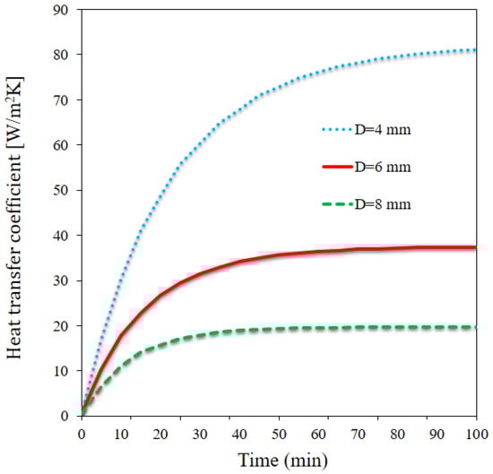 Figure 9 plots the HTR coefficient for pipes with diameters of 4, 6, and 8 mm over time. HTR between the pipe and PCM was found to be strongly dependent on the diameter, and an increase in the D_Pipe decreased the HTR coefficient. The HTR coefficient between the pipe and PCM changes incrementally for a longer time and was smaller for larger D_Pipes. A change in the PCM temperature substantially influenced the amount of HTR; an increase in the PCM temperature increased the temperature difference between the pipe and PCM, increasing the amount of HTR. In addition, the increased diameter enlarged the HTR surface area. As can be seen, the increased surface area reduced the overall HTR coefficient due to the integration of local HTR coefficients, and the HTR coefficient experienced a smaller increase with the increase in diameter due to the larger surface areas. Furthermore, the rapid melting and, therefore, temperature increase in the PCM increased the amount of HTR between the PCM and pipe. For a D_Pipe of 4 mm, the PCM melted and experienced an increased temperature within a shorter time, leading to a larger HTR coefficient.