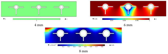 The velocity contour of the horizontal cross section of the middle portion of the panel for D_Pipes of 4, 6, and 8 mm.