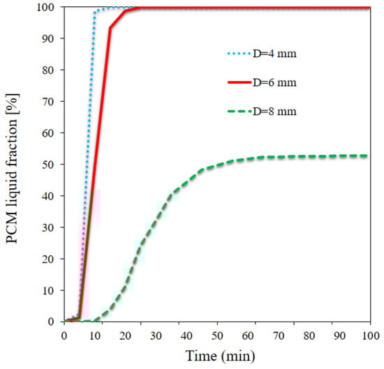 The volume percentage of PCM that has melted for D Pipes that are 4, 6, and 8 mm in time.
