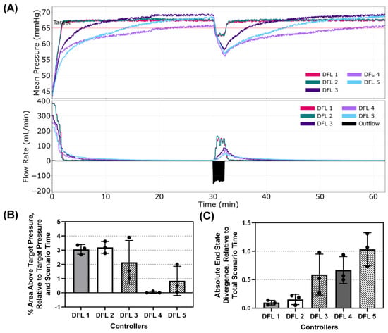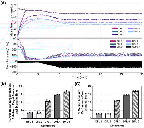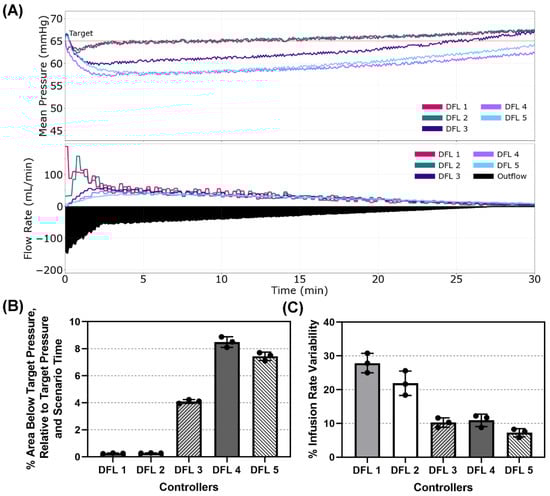 Lastly, Scenario 4 provided the most complications of the scenarios tested. The patient began with a low MAP of 45 mmHg and presented with an ongoing non-compressible hemorrhage. This hemorrhage gradually slowed over time as the result of coagulation, but after 5 min, simulated coagulopathy was introduced gradually accelerating the hemorrhage until reaching a maximum rate of ~125 mL/min. This scenario was designed to tease out weaknesses of the controllers resulting in equilibrating infusion and outflow at a steady state that significantly deviates from the target. Plots of the MAP vs. Time and Flow Rate vs. Time for a single run of each controller are presented in Figure 7A. Percent Area Below Target and % MDAPE at Steady-State are shown in Figure 7B,C, respectively, and results for all performance metrics can be found in Table A4. These two metrics correlate closely in this scenario with the controller ranking and metric values nearly equal between the two. DFL 2 performed the best (3.56% area below target, 2.69% MDAPE at Steady State) and DFL 1 was nearly identical (3.56% area below target, 2.70% MDAPE at Steady State). DFL 3 (10.9% area below target, 10.8% MDAPE at Steady State) and DFL 4 (14.6% area below target,14.4% MDAPE at Steady State) were next, and DFL 5 performed the worst in these two metrics (16.6% area below target, 16.8% MDAPE at Steady State).