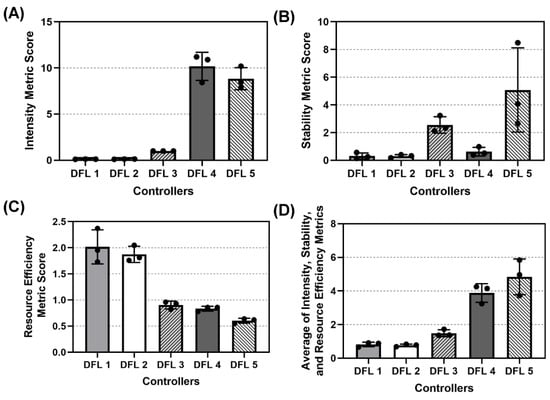 Aggregate metric results for dual-input fuzzy logic controller configurations. Aggregate (A) Intensity, (B) Stability, (C) Resource Efficiency, and (D) Average across the three metric results are shown as mean values from three subject variability runs, with error bars denoting standard deviation.