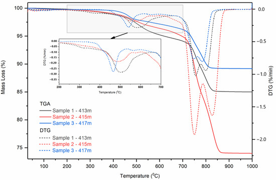 In order to obtain accurate data about the contents of organic matter in the studied samples, we applied a thermal analysis technique (TG/DSC). The experiments were carried out in a dynamic air–nitrogen medium at a linear heating rate of 10 °C/min from room temperature to 900 °C in corundum crucibles with an 85 μL internal volume. The device was preheated for one week to achieve a stable signal of mass and temperature curves. The temperature of the circulation thermostat connected to the device was 25 °C. The gases used in the experiments possessed a high degree of purity (99%), which is an important criterion for a successful experiment. For additional cleaning, a replaceable system of low-pressure filters (up to 10 bar) was used. Figure 2 shows the obtained TG and DTG curves of the combustion of the studied samples.
