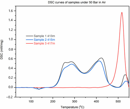 High-pressure differential scanning calorimetry (HPDSC) was applied to estimate the parameters of in situ combustion that should be taken into consideration during the displacement experiments in the combustion tube. The results obtained from the HPDSC are presented in Figure 3.