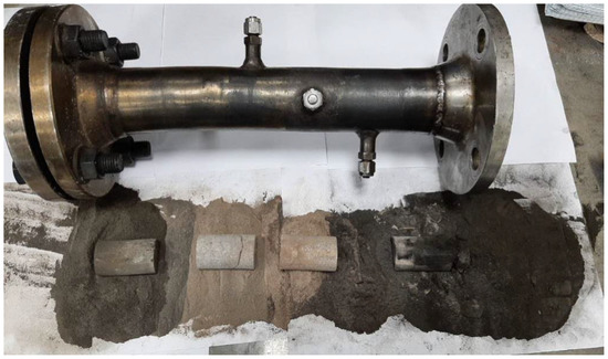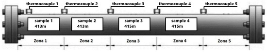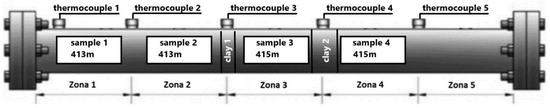 The experiments were carried out in a combustion tube with a 30 cm length and a 5 cm internal diameter (Figure 4 and Figure 5). The composite model was packed in a core holder. The first thermocouple was located directly at the input of the core holder, and each subsequent thermocouple was in front of the core samples.