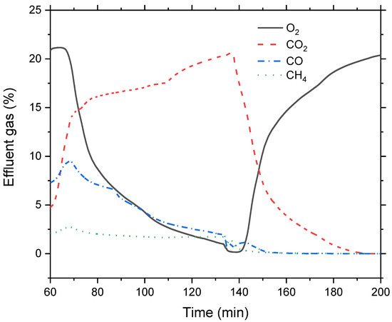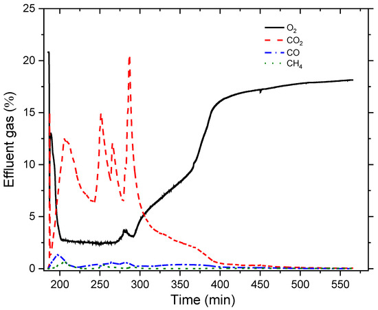 In addition, the effluent gas evolution highlighted a noticeable drop in the oxygen content at the output of the model and an increase in the CO2 content to 15–20% at the 185th minute, which indicated the beginning of the combustion process.