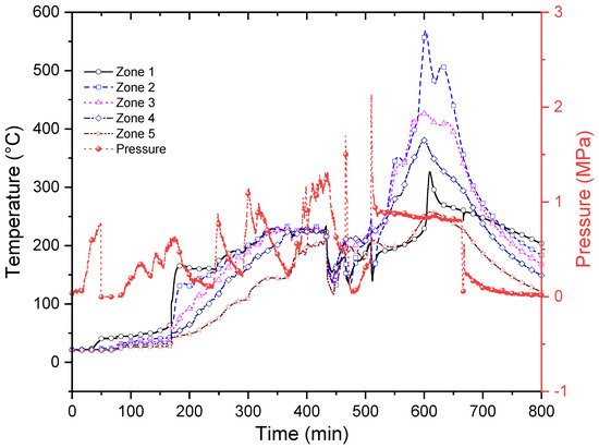 Figure 13 shows that the combustion process was initiated in the 510th minute in the first zone, with a noticeable increase in temperature. The obtained temperature–pressure profile shows no sequential peak achievement in any zone. However, the temperature values were different in each zone, which can be explained by the fact, that combustion began simultaneously in all model zones, with a tendency to decrease the temperature from the initial zone to the final zone. In addition, the pressure profile obtained during the experiment expresses significant perturbation, which demonstrates the model’s uneven filtration of vapor and gases.