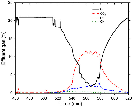 The effluent gas evolution (Figure 8) during the standard core model combustion (ISC-1) indicated more than 15% CO2 content, with a maximum value of 20.5% in the exhaust gas mixture, which indicated stable combustion front behavior. Moreover, the maximum temperature peak (700 °C) indicated in Figure 8 was related to the release of methane gas from oil. In addition, the proportion of effluent gases was found to increase naturally with the oxygen reduction in the effluent gas composition, as shown in Figure 8.
