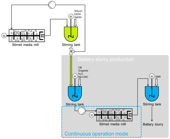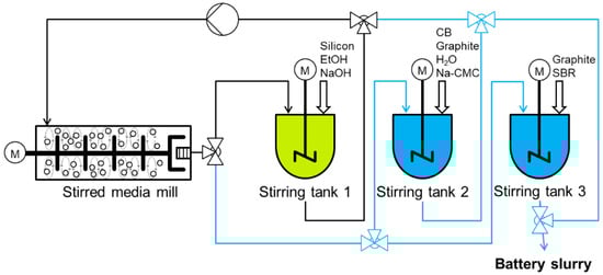 As it was already known that one to a few mill passages would be sufficient for the size reduction in the carbon black, the strategy was chosen to process all battery slurry components together within a passage-based operation of the mill. An exception was made regarding the silicon particles, which needed to be ground to such fine values that the circuit operation of the mill was chosen upstream. Thus, this process step was identical to the silicon grinding step of the reference process.