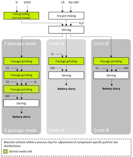 For the following investigations on coating suspension production with a continuously operated stirred media mill, these parameters were used, and two process variants were investigated, in which the graphite was added before (Conti-A) and after the continuous passage (Conti-B) through the stirred media mill. In order to obtain an overview of the investigated processes used for the production of the battery slurry in a stirred media mill, the schematic summary of the process strategies in
