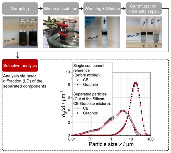 Figure 9, described protection effect). Thus, coarser carbon black agglomerates remain in the mixture compared to the Conti-B processing without the presence of the graphite particles. Thus, both effects support the formation of a broader particle size distribution. The very narrow particle size distribution resulting from the Conti-B process might be caused by the addition of the agglomerated silicon nanoparticles and, thus, by an increased viscosity which improved the shear forces acting on the carbon black particles.