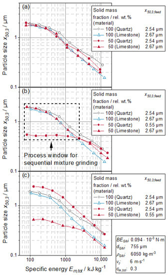 19], the capturing of multiple particles is very likely in this particle size range. At the same time, the particle-specific stress energy demand also decreases because the ratio of the provided stress energy of the grinding media related to the average captured particle mass and the stress intensity required for a particle breakage increases. Hence, it can be assumed that in the case of fine limestone particles, the transferable stress energy is sufficient on average to cause a fracture. Therefore, the fracture behavior of the particles is set according to their fracture-relevant material properties so that the material-specific grinding course of both components in the mixture follows the respective course of their individual material grinding course.