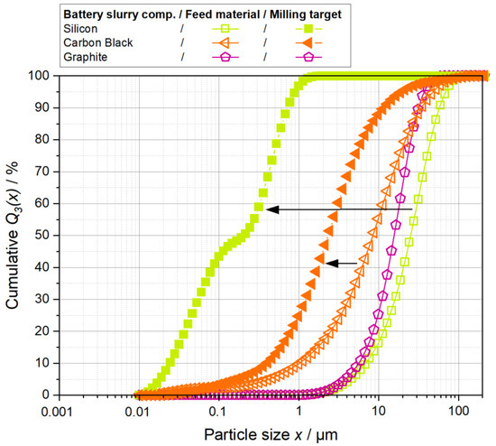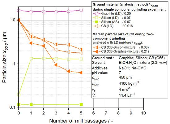 x50.3 (AS) = 120 nm) proceed at almost identical levels, resulting in a reduction in the median value from 10 µm to about 2 µm at the end of the process. This result can be explained by the existing size ratios of the particulate components since the silicon particles are smaller than the carbon black agglomerates, and therefore the latter is exposed to the grinding media with the same frequency and intensity compared to the individual milling of the carbon black. However, it is interesting to note that multicomponent comminution with a carbon black—graphite mixture results in a more efficient comminution of the carbon black. In this case, the graphite particles increase the intensity and/or frequency of stresses acting on the carbon black agglomerates. Stadler et al. [