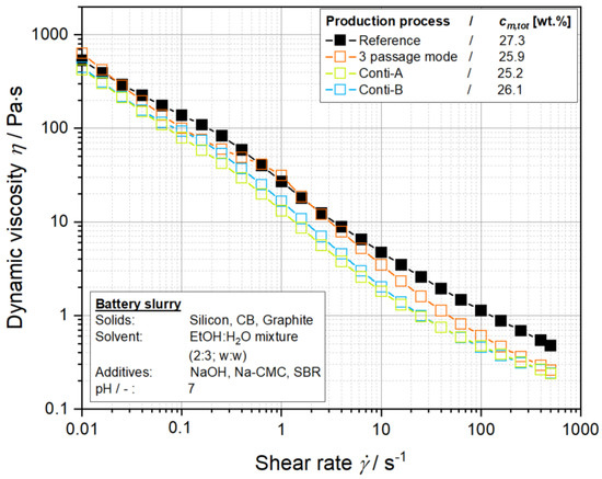 Figure 14, a similar structuring of carbon black for all produced battery slurries can be proven. In contrast to this, the suspensions produced with the process variants based on the stirred media mill exhibit a slightly lower viscosity in the higher shear rate range compared to the reference process. Within this shear rate range, the viscosity is mainly influenced by the total solids concentration