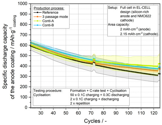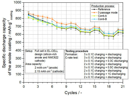 Figure 15 shows the dynamic viscosity of the coating suspensions as a function of the shear rate. All suspensions exhibit comparable shear-thinning flow behavior, which is required for a successful coating process. Especially in the low shear rate range, it is known for battery suspensions that the fractal dimensions of the carbon black aggregates play a major role in the formation of a certain viscosity level [
