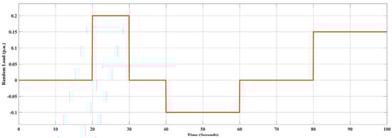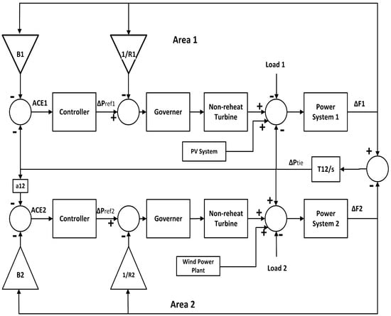 To ensure the security, stability and sustainability of the integrated power system equipment, the total output power generated in each controlled area should meet the total load needs while also accounting for system losses. When the system is subjected to any unexpected variations in load demand, the system must also be able to keep the frequency- and the interconnected area tie-line power within permissible limits []. As the load fluctuates over time, the generated power must be automatically updated to meet the demand. This configuration is known as automatic load frequency control (LFC). Thus, the LFC provides frequency balancing by regulating the speed of the prime mover, as well as stabilizing the tie-line power flow during normal and turbulent conditions [].