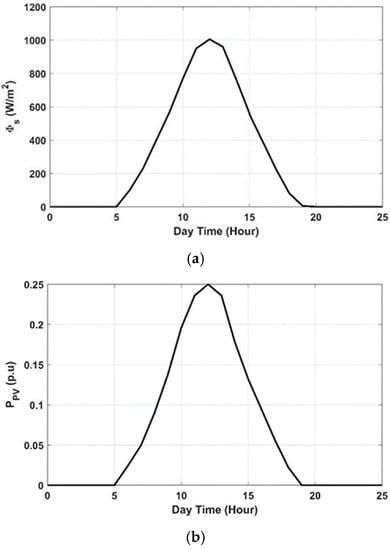 In this paper, the input of the PV model is real solar irradiance data obtained from a PV station located in Aswan, Egypt with a capacity of 1.5 GW. Figure 2 shows the input solar irradiance during the day with a maximum of 1000 W/ and the output PV power with a maximum of 0.25 p.u.