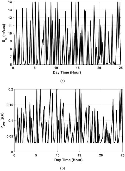 where and are the wind power plant gain and time constant, respectively. In order to represent the fluctuations in wind power, the real wind speed data obtained from the wind power plant located in Zafarana, Egypt, are used as input into the wind turbine generator model. Figure 3 shows the fluctuation in wind speed and the change in wind turbine output power.