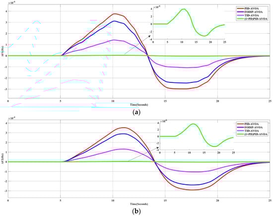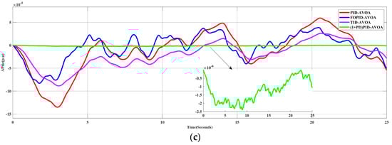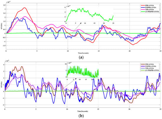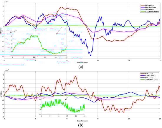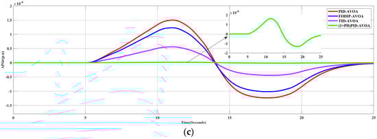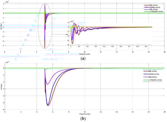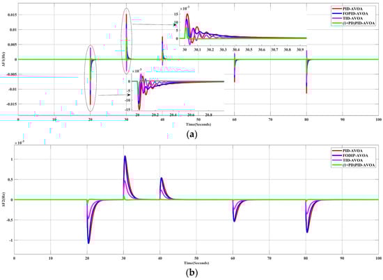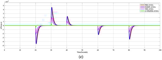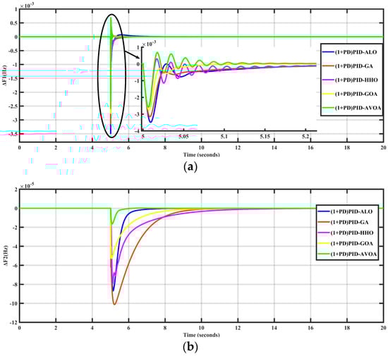 In this scenario, the performances of different types of controllers whose parameters were tuned by the optimization algorithm (AVOA) were examined. In order to achieve this, a 10% SLP in Area-1 was applied to the simulated system in the absence of RES generation. Figure 7 shows the frequency deviation in the two areas (ΔF1, ΔF2) and the change in the tie-line power (Δ). It can be obviously noted that the proposed controller has a better response than the other controllers.