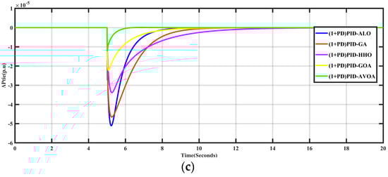 In this part of the study, various optimization algorithms such as Ant Lion Optimizer (ALO), Genetic Algorithm (GA), Grasshopper Optimization Algorithm (GOA), Harris Hawks Optimization (HHO) and African Vultures Optimization Algorithm (AVOA) were applied to find the optimal parameters of the proposed (1+PD)-PID controller. To do this, 10% SLP was applied to the system in Area-1 without incorporating RES into the system and each optimization algorithm was applied to the studied system to obtain the presented controller parameters and the fitness function was calculated. Figure 6 shows the response of the system in terms of frequency deviation in the two areas (ΔF1, ΔF2) and the change in the tie-line power (Δ). Obviously, AVOA has the best performance among other optimization algorithms, and it has the lowest fitness function of 6.01 × 10−5 against 12.64 × 10−5, 26.28 × 10−5, 27.61 × 10−5, and 35.65 × 10−5 for GOA, HHO, ALO and GA, respectively.