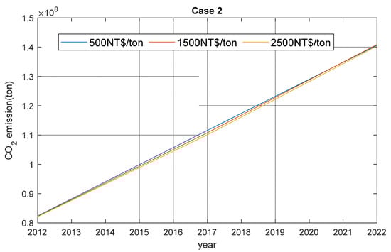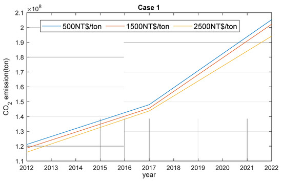 The analysis of case 1 has three scenarios, which vary with the different carbon tax levels. The minimal total cost is an objective function, which sets the carbon taxes at 500 NT$/ton, 1500 NT$/ton, and 2500 NT$/ton without considering CO2 emission constraints. Table 3 shows the summary of the simulation results of Case 1. In 2012, when the carbon tax was set at 500 NT$/ton, the carbon emission was higher than when the carbon tax was set at 1500 NT$/ton and 2500 NT$/ton. As the capacity of coal-fired plants is expected to increase in 2022, the CO2 emissions produced will be nearly twice the emission output in 2012. The average costs are 3142.95 NT$/MW, 3665.53 NT$/MW, and 4251.42 NT$/MW if the carbon taxes are 500 NT$/ton, 1500 NT$/ton, and 2500 NT$/ton in 2012, respectively. Due to the increased cost of fuels, the average costs in 2017 and 2022 will double and triple, respectively, compared to the average cost in 2012. According to the data of the TPC [20], the average annual carbon emission in 2012 was 0.536 kg/kwh. As shown in Table 3, the results for 2012 and 2017 are close to the data of the TPC. As more coal-fired plants will commit in 2022, the average annual carbon emission will approach to 0.65 kg/kwh. The executed time of Case-1 is about 53.2 s.