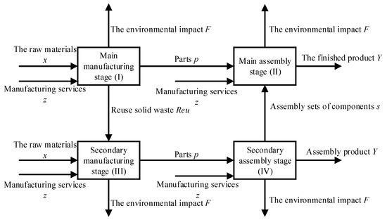 The parallel manufacturing service efficiency of complex product systems considering solid waste recycling and reuse based on the intuitionistic fuzzy super-efficiency DEA is illustrated in Figure 2. The manufacturing process of complex product systems can be simplified as two parallel manufacturing service chains that represent the processing process of core components and supporting components, respectively. This involves the processing stage and the assembly stage, with a total of four decision-making units (DMUs). The input of each DMU is mainly raw materials and the corresponding manufacturing services. Additionally, the manufacturing service factor (the ratio of the actual manufacturing time needed to complete the production process to the theoretical order completion time) is introduced in this paper to analyze the manufacturing service quality. Then, the efficiency of the corresponding decision-making unit is calculated by combining the corresponding energy consumption and the number of processing personnel. In this way, the accuracy of the model is guaranteed. The output of each DMU is mainly products with industrial added value and environmental impact. In this paper, the corresponding amount of solid waste, noise, and carbon emissions are mainly used to calculate the efficiency of the decision-making unit regarding the environmental impact. Moreover, some solid wastes generated in the processing stage of core components are recycled as input in the processing stage of supporting components, and some supporting components are directly used in the production of complex product systems as input in the assembly stage of core components.