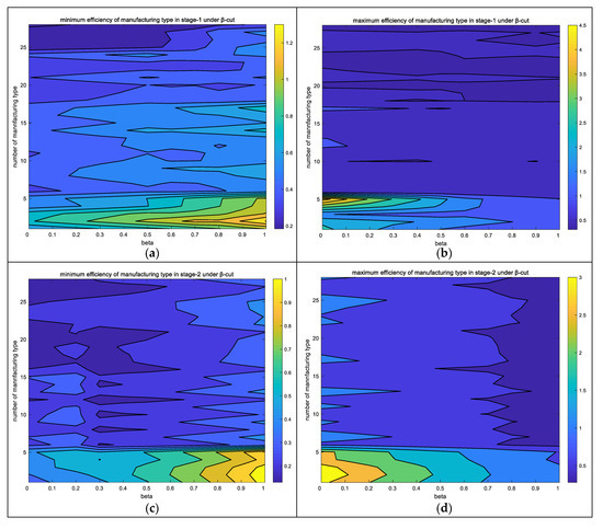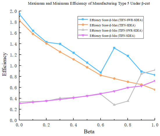 The process of using the α-cut method to calculate the minimum and maximum efficiencies of the TIFN-SWR-SDEA model is written in Equations (13)–(22). The efficiency interval calculated by the α-cut method is obtained. Similarly, the corresponding efficiency interval is obtained with the β-cut method.