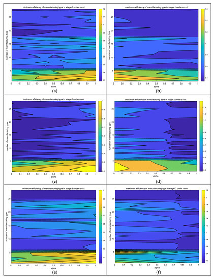 The efficiency measurement progresses in the stage of main manufacturing under the fuzzy DEA α-cut is shown in Algorithm 2. Use Algorithm 2 to complete the efficiency measurement. As Equation (23) expresses, the inputs are , . The desirable outputs are , . The undesirable output is .