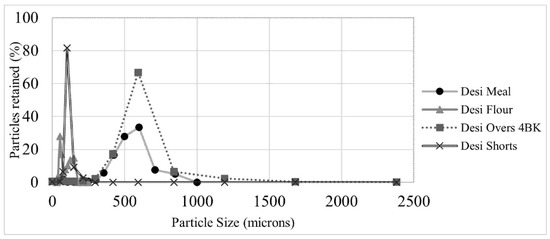 The particle sizes of the final products from both processes were recorded in Figure 2. The flour for both chickpeas follows similar particle size ranges, with a bimodal distribution of around 53 and 90–150 microns. These bimodal peaks were also seen in benchtop milling trials [23]. The previously mentioned strength theory that compared meal and flour could explain the bimodal peaks. The larger micron peak could contain more protein than the smaller micron peak. Further testing could be carried out to confirm this.