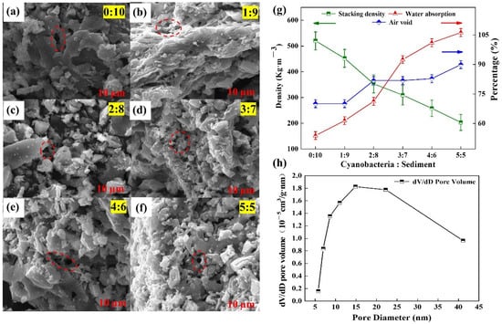 Effect of different cyanobacteria-to-sediment ratios on properties of ceramsite. (a–f) are electron microscope structure diagrams of water storage materials under different cyanobacteria-to-sediment ratios, (g) is stacking density and air void, and (h) is pore size distribution.
