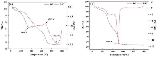 From Figure 3a,b, it can be seen that the evaporation of water and volatiles inside the sediment made the material decay in mass at 0–340.6 °C. As the temperature increased to 673.7 °C, the organic matter inside the material started to pyrolyze gradually. The pyrolysis gas production made the material mass decrease. When the temperature increased to 896.9 °C, the material became further exothermic but the mass remained unchanged. This indicated that the material started to crystallize and solidify internally. The weight of cyanobacteria powder decreased more at 509.8 °C. For fully pyrolyzing the organic matter in sediment and cyanobacteria into pores, the low temperature pyrolysis temperature range was determined by the future thermogravimetric material analysis.