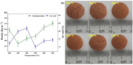 The degree of reaction in the low temperature pyrolysis section of organic matter on the pore-forming characteristics of ceramsite was further studied. The low temperature pyrolysis temperatures were 400 °C, 450 °C, 500 °C, 550 °C, 600 °C, and 650 °C, respectively, and underwent pyrolysis at 1050 °C. The results of the formation of ceramsite are shown in Figure 4. It can be seen from Figure 4a that with the change of low temperature pyrolysis temperature, the stacking density of ceramsite showed a trend of decreasing first and then increasing, while the air void increased first and then decreased. When the low temperature pyrolysis temperature was 500 °C, the air void reached the highest, which was 81.82%.