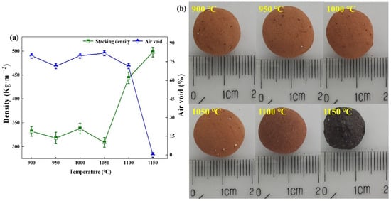 It can be seen from Figure 5a that when the high temperature pyrolysis temperature was 950 °C, the air void of the ceramsite decreased and then, with the increase of the high temperature pyrolysis temperature, the air void of the ceramsite increased first and then decreased. At 1050 °C, the air void reached the highest at 81.82%. The reason is that as the temperature rose to 900 °C, the easily decomposed salts inside the ceramsite began to produce gas and the internal pore structure was further enriched. When the temperature reached 950 °C, the material’s internal structure collapsed due to softening and the air void decreased [,]. With the increase in temperature, the material interior began to crystallize and produced the corresponding skeleton structure, so inside the ceramsite many pore structures were formed []. When the high temperature pyrolysis temperature rose to 1150 °C, the surface of the material began to be smooth, the color of the ceramsite changed from brown to purple–black (Figure 5b), the volume decreased, and the air void was almost zero.