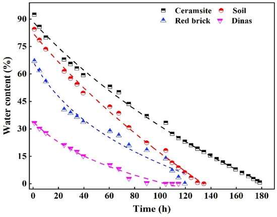 Ceramsite has a rich pore structure. Studying its water absorption and release performance is necessary to ensure its application in sponge city construction. Four kinds of materials with different pore structures—ceramsite, soil, red brick, and dinas—were selected to study the water release capacity of each material at a constant room temperature of 40 °C after total water absorption.