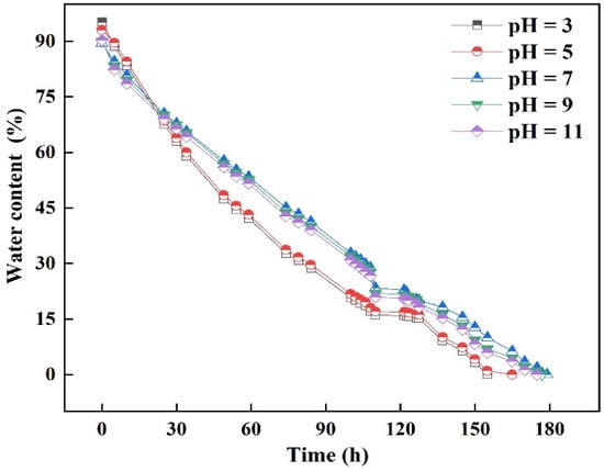 The water storage materials were analyzed under different pH conditions. The results are listed in Figure 8. It can be seen from Figure 8 that, when the pH was 3, the water absorption rate of ceramsite reached the highest at 95.2%, compared with other conditions. After 30 h of water release, the water release rate of ceramsite under acidic conditions increased significantly. The reason is that under acidic conditions, part of the pore walls of the internal pore structure of ceramsite was destroyed and the salt dissolution rate was 2.2%. Due to the destruction of the pore wall structure, the internal pore structure of the ceramsite was connected, the water absorption capacity was enhanced, and the water retention capacity was reduced. At pH 11, the alkaline solubility of ceramsite was 1.3%. It shows that the damage strength of the pore structure of ceramsite under alkaline conditions was weaker than that under acidic conditions. In the later water release experiment, the water release rate was lower than under acidic conditions. Due to the electronegativity of inorganic materials, the internal charge of ceramsite was changed under acidic conditions, affecting the water release results.