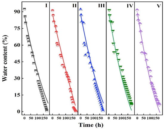 The water storage materials were analyzed under different temperature conditions. The results are shown in Figure 9. It can be seen from Figure 9 that, with the increase in temperature, the water release time of ceramsite gradually shortened. Compared with the release temperature of 5 °C, the release time at 45 °C was reduced by 116 h. Under a high temperature environment, the average kinetic energy of water molecules inside the ceramsite increased and the irregular movement of molecules was intense, which shortened the water release time inside the ceramsite [].